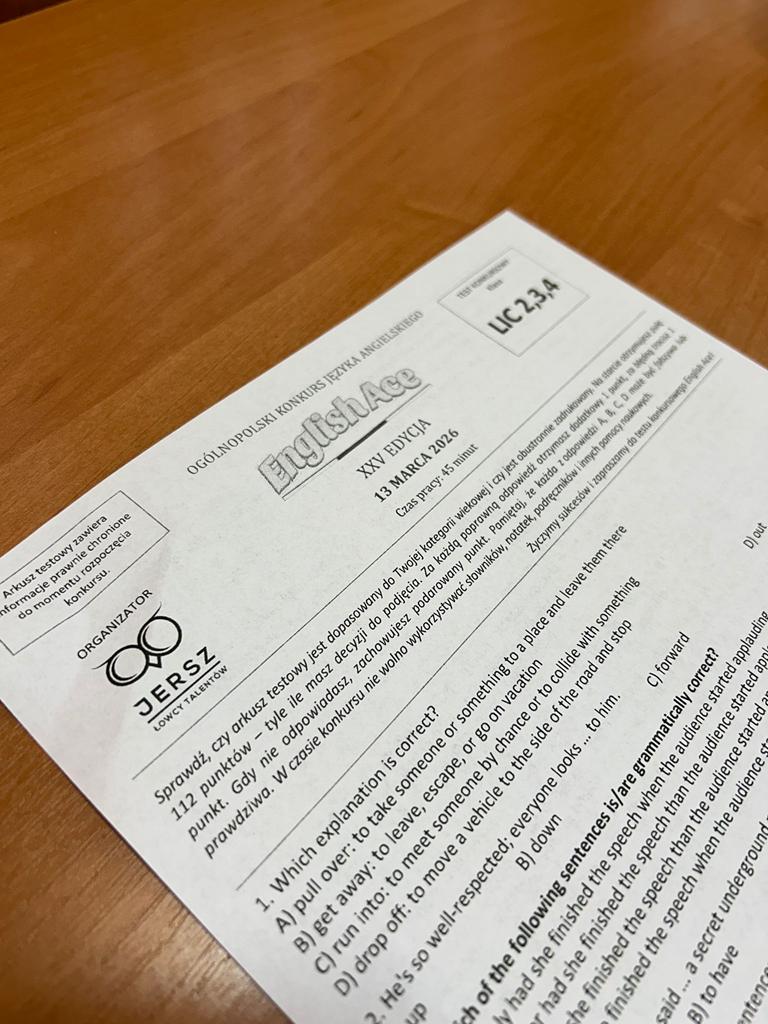 łonecznego popołudnia 13 marca 2026r. o godz. 13.00 nasi uczniowie zmagali się z zawiłymi zadaniami Ogólnopolskiego Konkursu Języka Angielskiego ENGLISH ACE. Do konkursu przystąpiło 11 uczniów klas pierwszych i trzecich liceum i technikum.