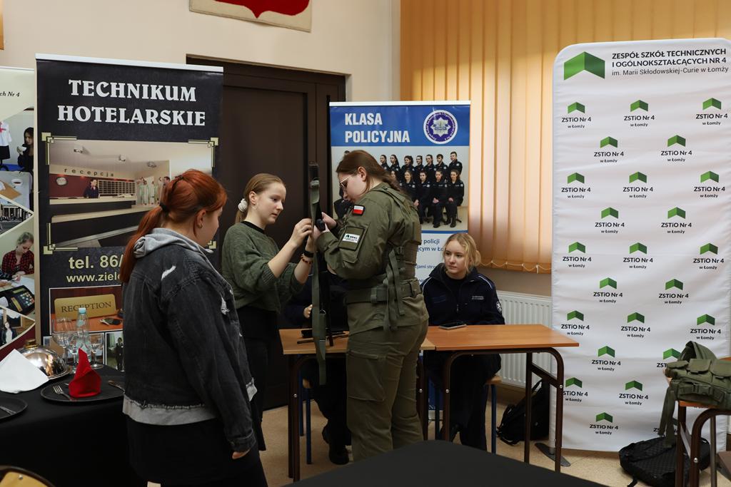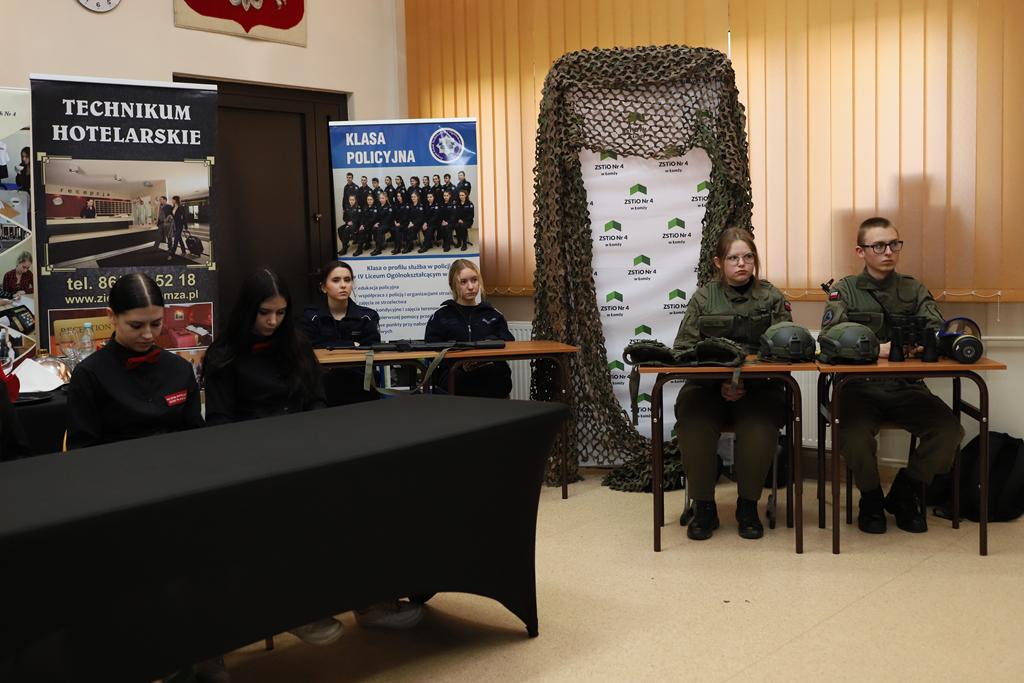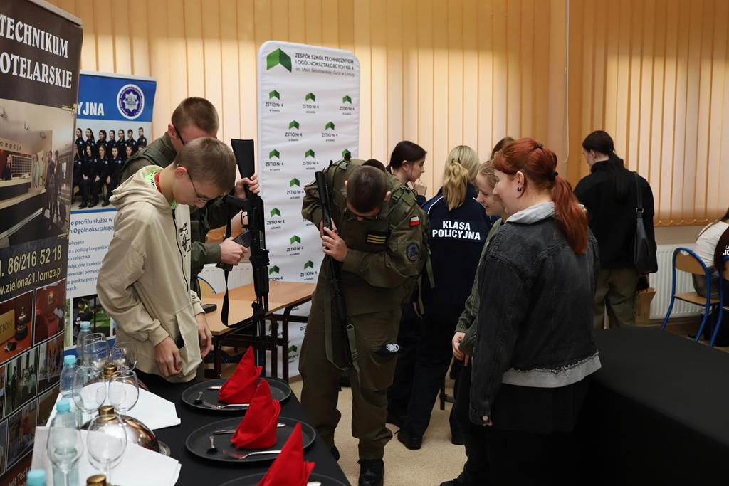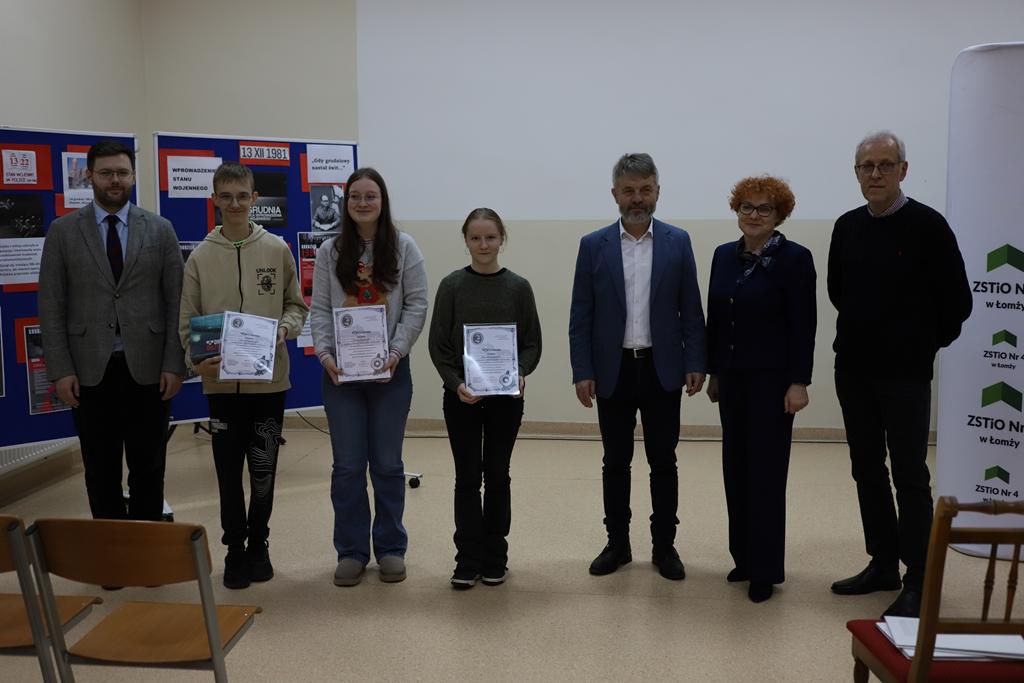Następnie ósmoklasiści ze Szkoły Podstawowej Nr 9 w Łomży wraz z opiekunem wzięli udział w warsztatach historycznych z wykorzystaniem przygotowanej prezentacji i mapy myśli „Stan wojenny”. Uczestniczyli także w promocji kierunków kształcenia w naszym zespole. Na zakończenie troje ósmoklasistów otrzymało wyróżnienia i nagrody za najlepiej wykonane prace na warsztatach historycznych, a ich opiekun podziękowanie.
