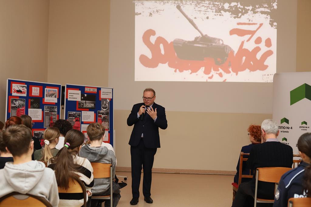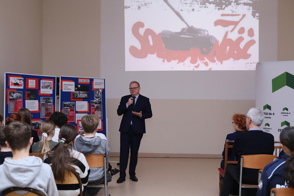 Kluczowym punktem uroczystości był wykład pana doktora habilitowanego Krzysztofa Sychowicza Dyrektora Oddziału Instytutu Pamięci Narodowej w Białymstoku. Prelegent bardzo sugestywnie przybliżył przyczyny wprowadzenia, realia i tragiczne skutki decyzji władz komunistycznych z 13 grudnia 1981 r w aspekcie ogólnopolskim i regionalnym. Podzielił się też osobistymi refleksjami i przeżyciami związanymi z 13 grudnia 1981r. Na przykładach rodzin aresztowanych i internowanych członków łomżyńskiej Solidarności podkreślił dramat tych osób i ich bliskich w okresie stanu wojennego. Prelekcja była inspirująca dla młodzieży. Uświadomiła jej jak trudno jest walczyć o wartości, mając przed sobą wybór „ prawda albo przetrwanie”.