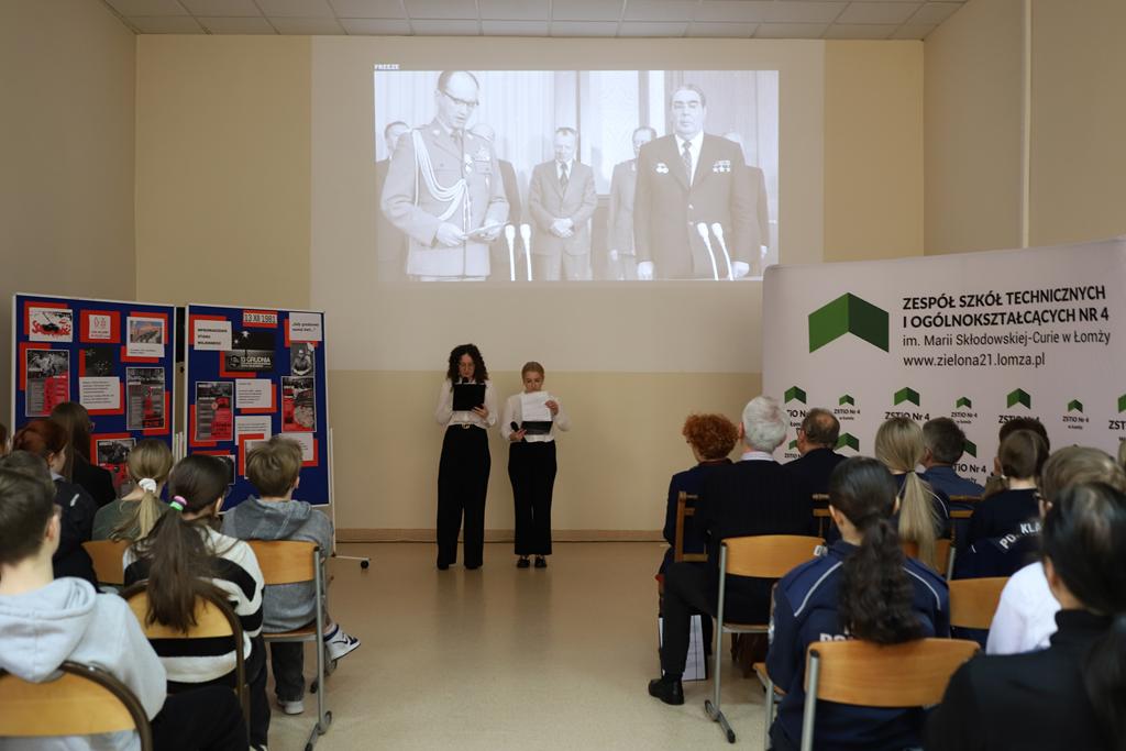 Utwór Przemysława Gintrowskiego „A my nie chcemy…” wprowadził wszystkich w klimat tamtych dramatycznych czasów. Uczennice - Zosia Cwalina i Natalia Mierzejewski z kl. 4PP - prowadzące program historyczno-muzyczny nakreśliły okoliczności wprowadzenia, represje i terror władz komunistycznych, opór opozycji i społeczeństwa polskiego w okresie stanu wojennego, trwającego od 13 grudnia 1981r. do 22 lipca 1983r. Narrację wzbogacały utwory muzyczne Jacka Kaczmarskiego ”Obława” oraz Przemysława Gintrowskiego, Jacka Kaczmarskiego i Zbigniewa Łapińskiego - „Modlitwa wschodzie słońca” z videoklipami obrazującymi tragizm wydarzeń, które wtedy miały miejsce w Polsce.