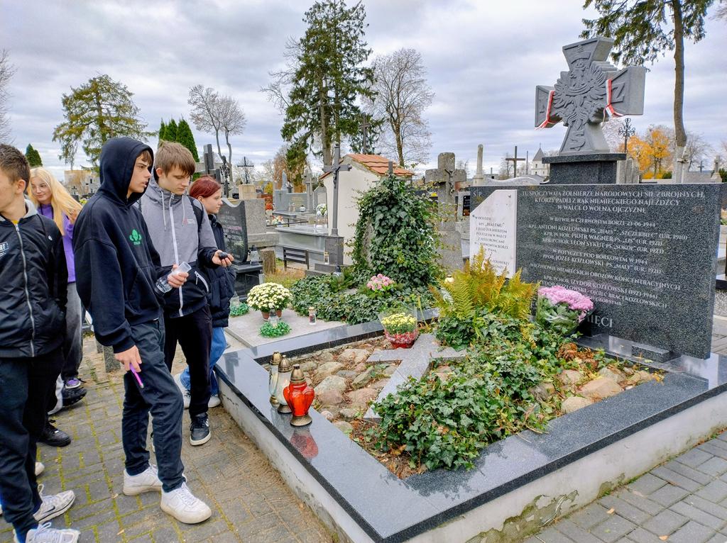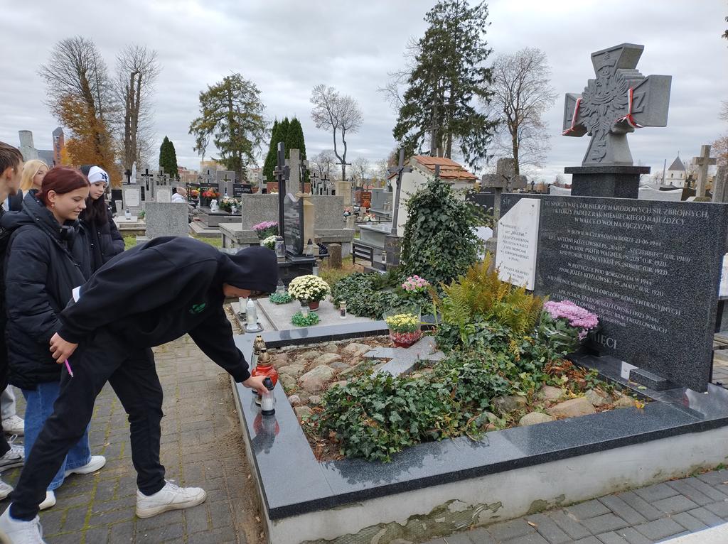 „Ojczyzna to ziemia i groby. Narody tracąc pamięć, tracą życie”. Cyprian Kamil Norwid 31 października- uczniowie kl. 1MZ , 1bBW oraz 3BW Szkoły Branżowej I stopnia pod opieką p. Kamila Galanka uczestniczyli w lekcji lokalnej historii i patriotyzmu. Młodzież, odwiedzając w przeddzień Święta Zmarłych zabytkową łomżyńską nekropolię przy ulicy M. Kopernika, zobaczyła nagrobki i pomniki upamiętniające zasłużonych Łomżan: m.in Jakuba Wagi oraz poległych podczas powstania listopadowego. Oddała też hołd lokalnym bohaterom walczącym o wolność Ojczyzny, zapalając znicze pamięci na grobach uczestników walk Legionów Polskich i wojny polsko-bolszewickiej 1920r.: majora Gwido Mieczysława Bursy oraz ppłk. Jerzego Sawy Sawickiego- dowódcy 33 Pułku Piechoty w Łomży, a także obrońcy Westerplatte we wrześniu 1939r.-Wincentego Kłysa oraz na zbiorowej mogile Żołnierzy Narodowych Sił Zbrojnych. Uczniowie wykonali zdjęcia nagrobków tych postaci. Fotografie zostaną zaprezentowane społeczności naszego zespołu na ekspozycji szkolnej w ramach projektu historycznego „Łomżyńscy bohaterowie walk o wolność Ojczyzny” realizowanego pod kierunkiem p. Elżbiety Wiśniewskiej.