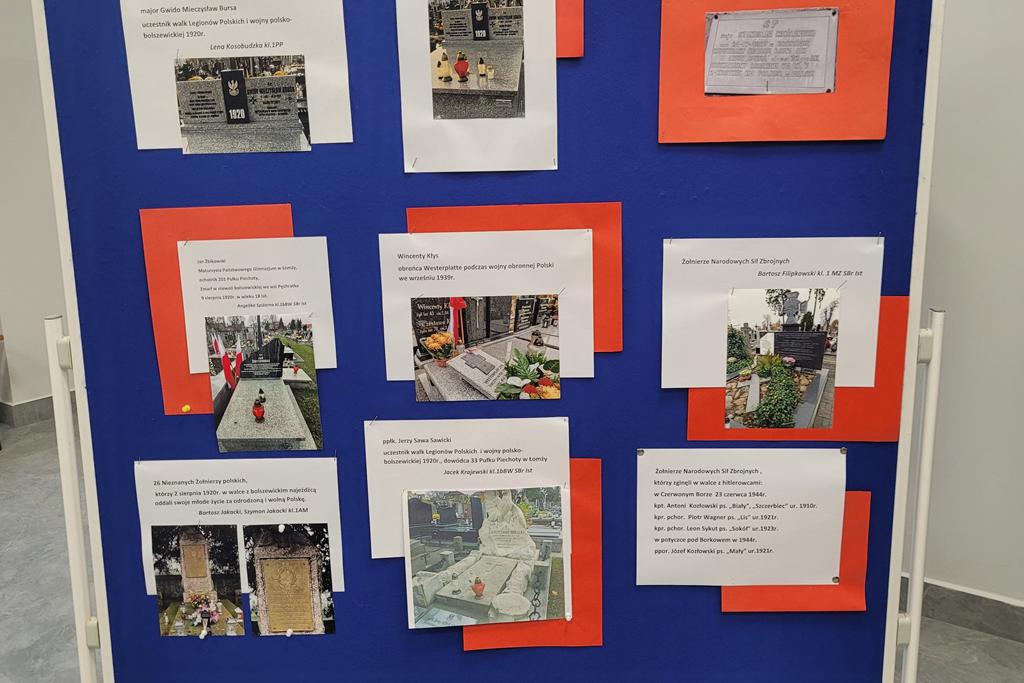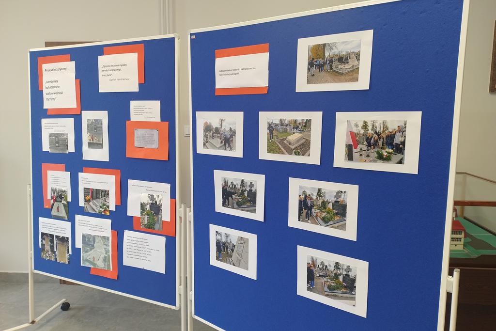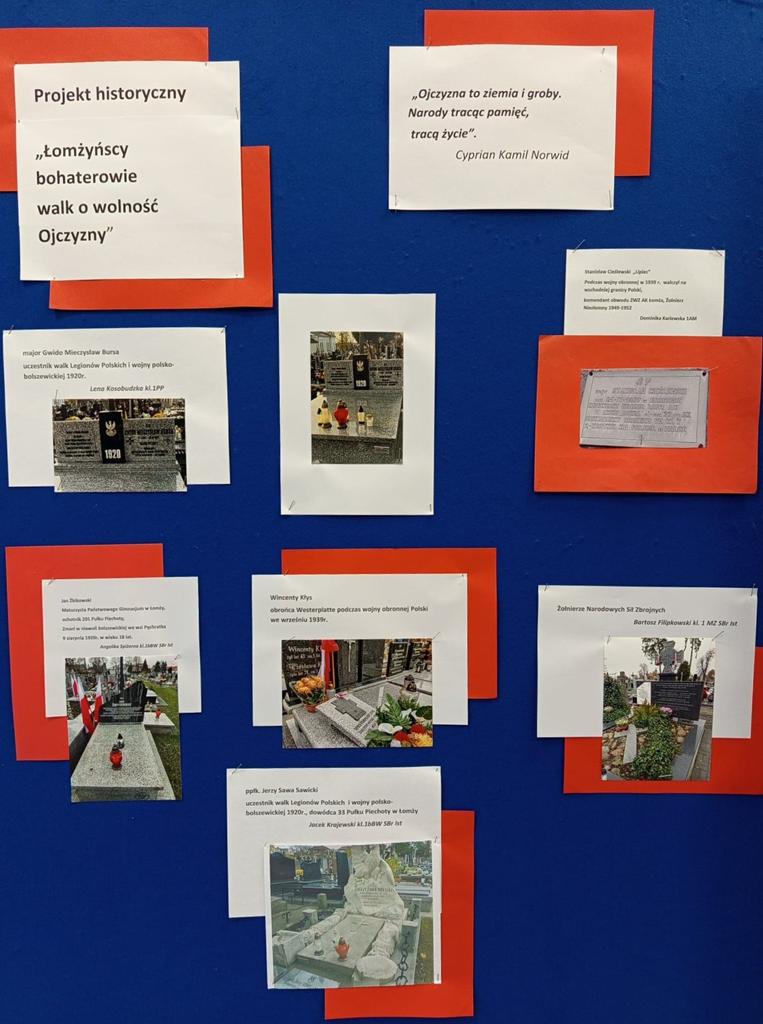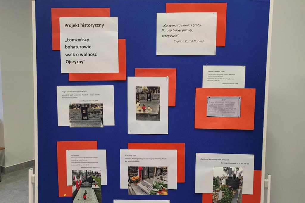 Prace uczniów zostały zaprezentowane społeczności szkolnej na ekspozycji „Projekt historyczny „Łomżyńscy bohaterowie walk o wolność Ojczyzny”.