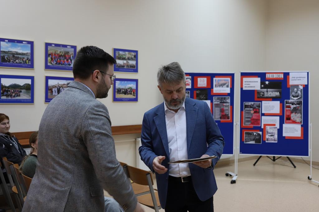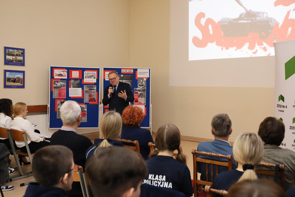 Kluczowym punktem uroczystości był wykład pana doktora habilitowanego Krzysztofa Sychowicza Dyrektora Oddziału Instytutu Pamięci Narodowej w Białymstoku. Prelegent bardzo sugestywnie przybliżył przyczyny wprowadzenia, realia i tragiczne skutki decyzji władz komunistycznych z 13 grudnia 1981 r w aspekcie ogólnopolskim i regionalnym. Podzielił się też osobistymi refleksjami i przeżyciami związanymi z 13 grudnia 1981r. Na przykładach rodzin aresztowanych i internowanych członków łomżyńskiej Solidarności podkreślił dramat tych osób i ich bliskich w okresie stanu wojennego. Prelekcja była inspirująca dla młodzieży. Uświadomiła jej jak trudno jest walczyć o wartości, mając przed sobą wybór „ prawda albo przetrwanie”.
